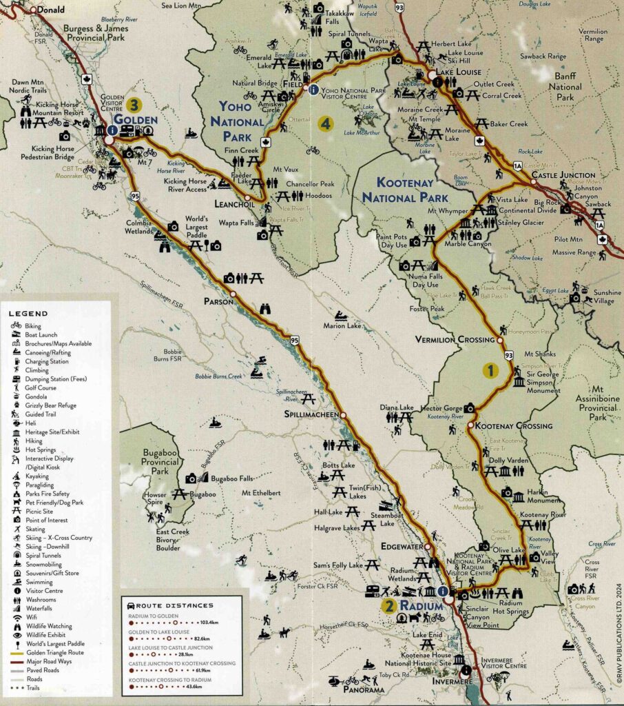 The Golden Triangle is a route from Lake Louise through Yoho National Park to Golden, BC, south along the Columbia Valley to Radium, BC, and back to Lake Louise via Highway 93S and the Trans Canada Highway/Bow Valley Parkway.