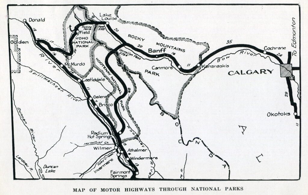 The Banff-Windermere Highway through Kootenay Park was completed in 1923, and the Lake Louise-to-Golden highway through Yoho was opened in 1927. These two roads plus Highway 95 between Radium and Golden provided a perfect loop for early motorists.