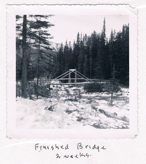 When we went in to build the bridge across the Simpson it had snowed as we were going in so we had wet snow conditions to work with. We fell 2 trees across the river for our stringers. After building our log peers we filled them with rocks out of the river. (One cold job as I remember) Then got the stringers onto the peers. We then split jackpine logs to make a flat deck and made our pole trusses. I can’t remember how we attached the large turnbuckles to finish the trusses and I can’t make them out in the photo.